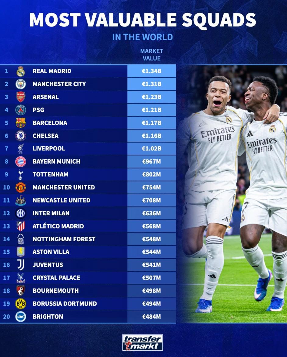 开云kaiyun官方网站-世界俱乐部身价前20:皇马13.4亿欧第1,曼城第2,阿森纳第3
